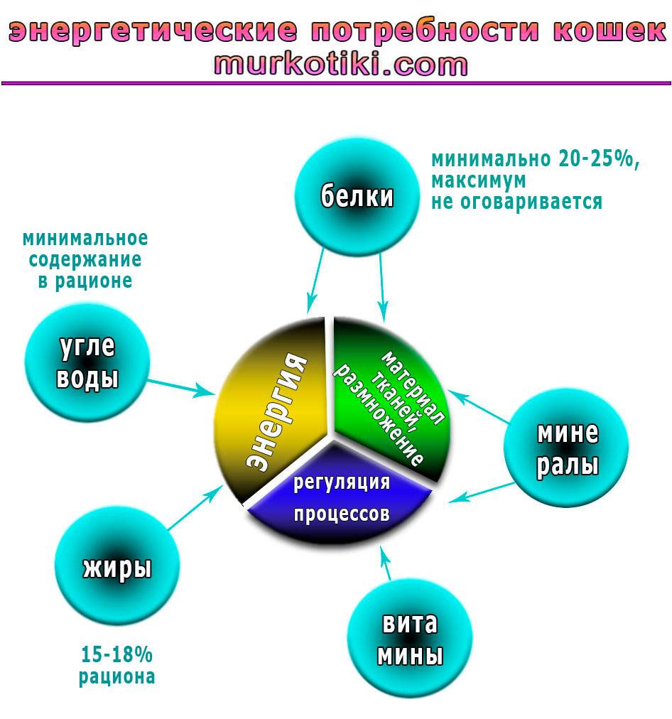 Жиры восполняют запас жирорастворимых витаминов и, необходимых для полноценного обмена веществ, заменимых и незаменимых жирных кислот. Нормальное содержание жира в рационе кошек должно быть не меньше 20% для котят и 15% для взрослых животных.