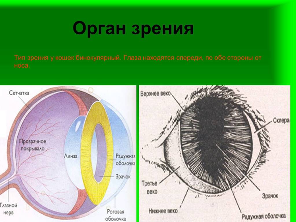 Строение глаза кошки мало отличается от человеческого и видит кошка по тому же принципу, что и мы – реагирует на свет. Зрачок имеет свойство увеличиваться или уменьшаться с помощью специальной мышцы, и его размер зависит от количества света. В темноте кошка видит с помощью особого слоя сосудистой оболочки – тапетума. Он служит как бы зеркалом, который отражает полученный глазами свет, и за счет этого зрение обостряется. Тапетум так же является причиной того, что глаза кошки светятся в темноте.
