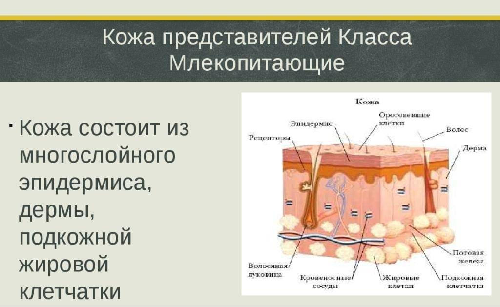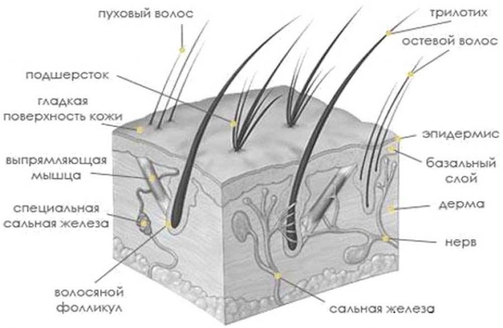 Кожа, как и система мышц, имеет ряд функций. Она реагирует на любые изменения, происходящие с питомцем, и регулирует температуру тела. Она пронизана сосудами и железами, а на поверхностном слое находятся корни волос.