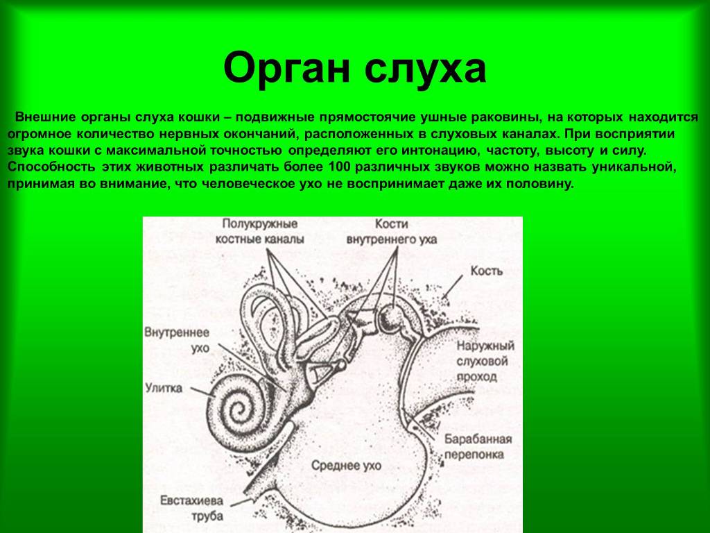 Строение уха кошки позволяет ей улавливать более 100 звуков, в том числе ультразвуковых, при помощи которых кошки общаются с котятами. В слуховых каналах так же сосредоточено невероятное количество нервных окончаний и более 10 мышц. Именно поэтому кошки могут менять положение ушей на голове – прижимать их, изгибать, поворачивать в сторону звука и т.д.