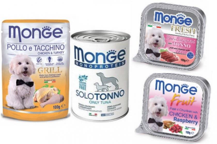 Питание супер-премиум класса выпускается в сухом и во влажном виде (консервы). Полная линия кормов «Monge», произведенная в Италии, включает питание для собак разных пород: мелких (до 3 кг), средних и крупных.