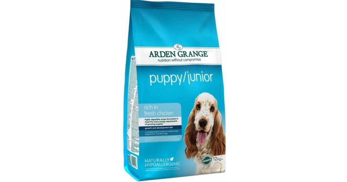 - Arden Grange Puppy Junior — натуральное лакомство для щенков мелких и средних пород. В нем содержится повышенное количество белка (29%), а также витамин D, фосфор и кальций. Все перечисленные составляющие чрезвычайно важны для правильного развития опорно-двигательного аппарата.