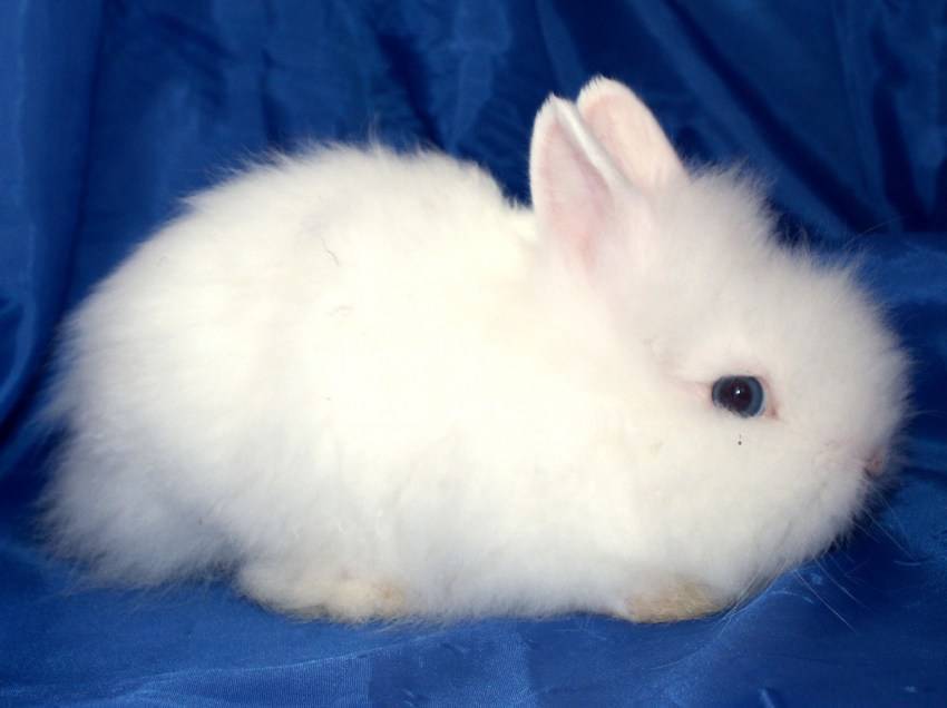 Эта относительно молодая порода выведена в минувшем столетии на основе классических ангор. Ее представители отличаются средними размерами и весят около 4 кг при длине до 54 см. Белые пуховые кроли имеют аккуратные уши и короткие конечности.