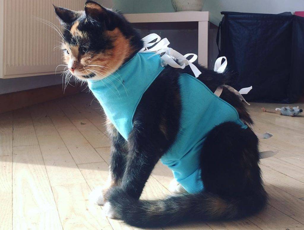 Чтобы закрыть рану на теле домашней кошки, обычного бинтования недостаточно. Чувствуя боль, животное стаскивает повязку и выгрызает хирургические нитки, рискуя занести в шов инфекцию. Поэтому ветеринары советуют надеть на питомицу стерильную попону. Она представляет собой покрывало с отверстиями для лапок и завязывается на спине с помощью лент. Приспособление закрывает нижнюю часть туловища кошки от шеи до хвоста.