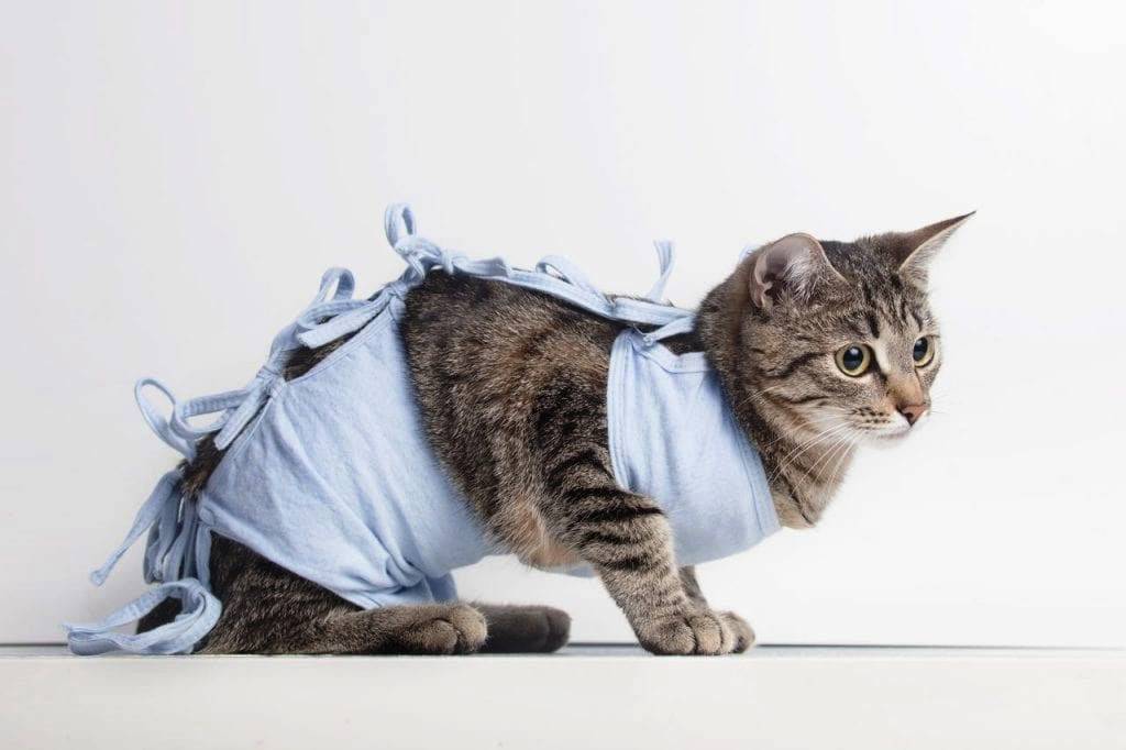 Чтобы закрыть рану на теле домашней кошки, обычного бинтования недостаточно. Чувствуя боль, животное стаскивает повязку и выгрызает хирургические нитки, рискуя занести в шов инфекцию. Поэтому ветеринары советуют надеть на питомицу стерильную попону. Она представляет собой покрывало с отверстиями для лапок и завязывается на спине с помощью лент. Приспособление закрывает нижнюю часть туловища кошки от шеи до хвоста.