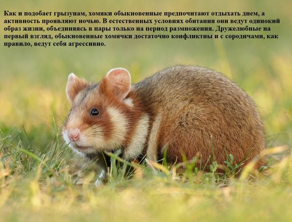 В общей массе дикие хомяки живут “холостяцкой” жизнью, встречаясь с противоположным полом лишь на период размножения. Обычно он приходится на весенние и летние месяцы.
