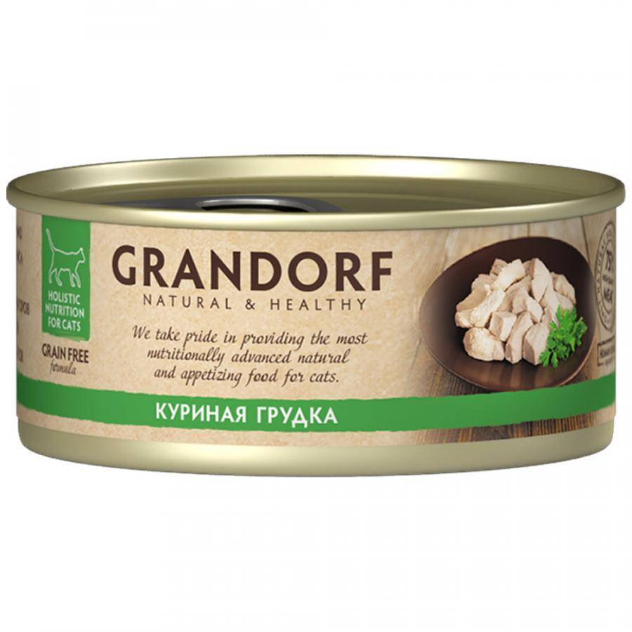 Линейка корма Грандорф включает в себя курятину, рис, витамины и минералы, поэтому маленькая собака будет в восторге от такого блюда. Для крупных пород выпускаются консервы со вкусом идейки, кролика и телятины. В одной упаковке содержится до 80 % мяса.