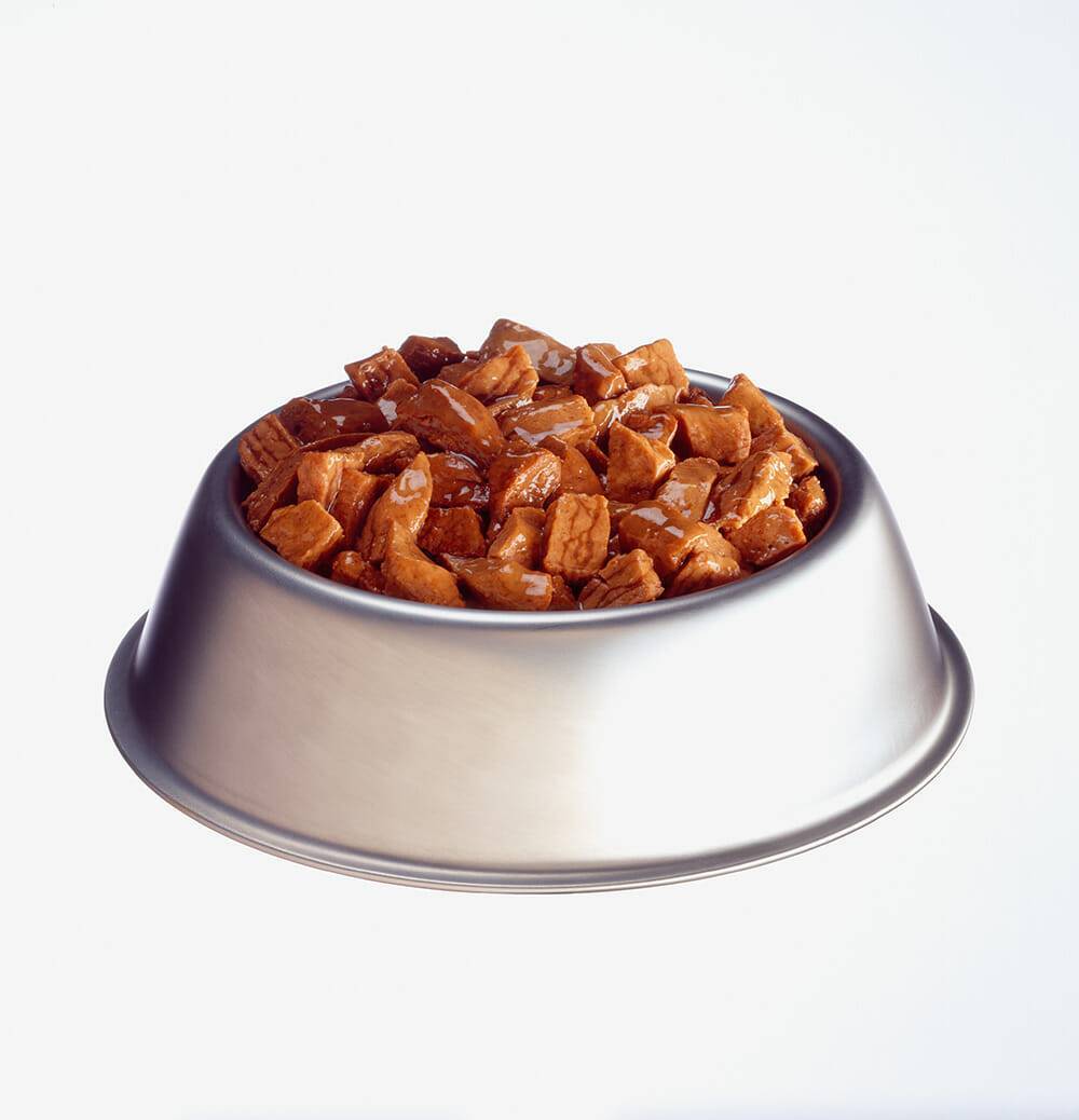 Используется в качестве основного питания и имеет отличное качество. В составе владелец животного сможет найти кусочки мяса с подливой, количество белков не менее 50 %. Консервы выпускаются в жестяных банках, подходят для питомцев, которые страдают от избытка лишнего веса.
