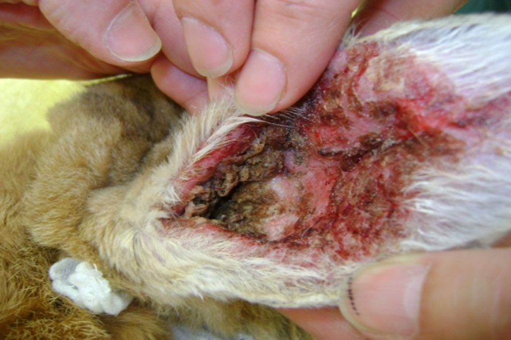Ощутимые страдания животному доставляют язвы и свищи на нижних конечностях. Пододерматит возникает у кроликов, имеющих избыточную массу тела, и особей в возрасте старше 3 месяцев.