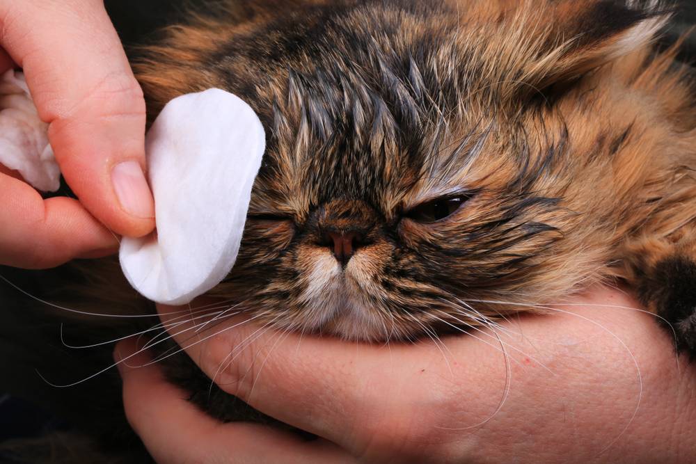 Если у кошки сильно слиплись веки от гноя, то их надо хорошенько размочить, а затем уже аккуратно очищать. Никогда не пытайтесь очистить слипшиеся веки животного сухим тампоном. Это только раздражает воспаленные поверхности.