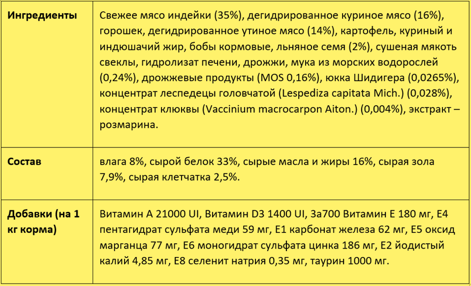 В беззерновом корме вместо злаков использовали картофель. Индюшиный и куриный жир обогатили питание энергией, а также незаменимыми жирными кислотами.