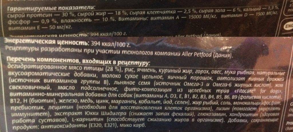 Фото состава указанного на упаковке корма.