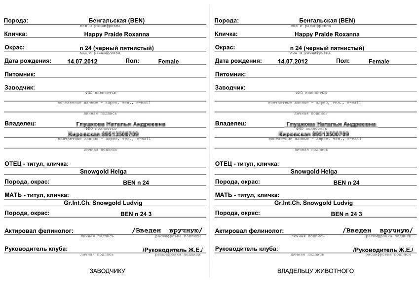 В бланке помимо номера, указывается имя кошки, ее порода, окрас, ее родители, дата рождения, имя владельца и заводчика животного; эмблема системы и подпись ее секретаря (факсимиле).
