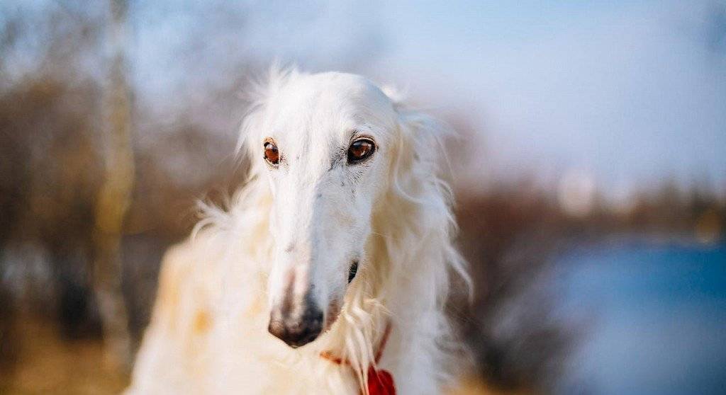 У русской псовой борзой красивые выразительные глаза: миндалевидной формы, чуть выпуклые, насыщенного карего окраса.