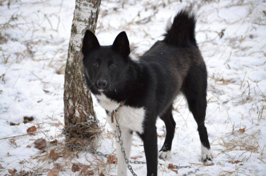 Охотничья собака квадратного формата с сухим мускулистым телосложением. В росте кобели достигают 52-58 см, а суки 50-56 см. Весят представители породы 18-25 кг. Отличительная черта – черно-белый или чисто черный окрасы. Внешне самая утонченная и грациозная Лайка. Охотятся на любую дичь, но требуют определенной подготовки. Могут служить охранниками.