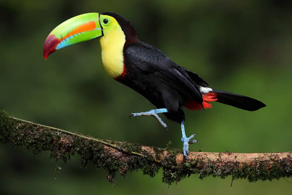 Это очень красивая птица, длина тела которой достигает 53 см, а средний вес – 400 г. Ее главное украшение огромный полый клюв (до 17 см) яркой расцветки. И сам радужный тукан очень красив, но обладает неприятным голосом, похожим на кваканье лягушек.