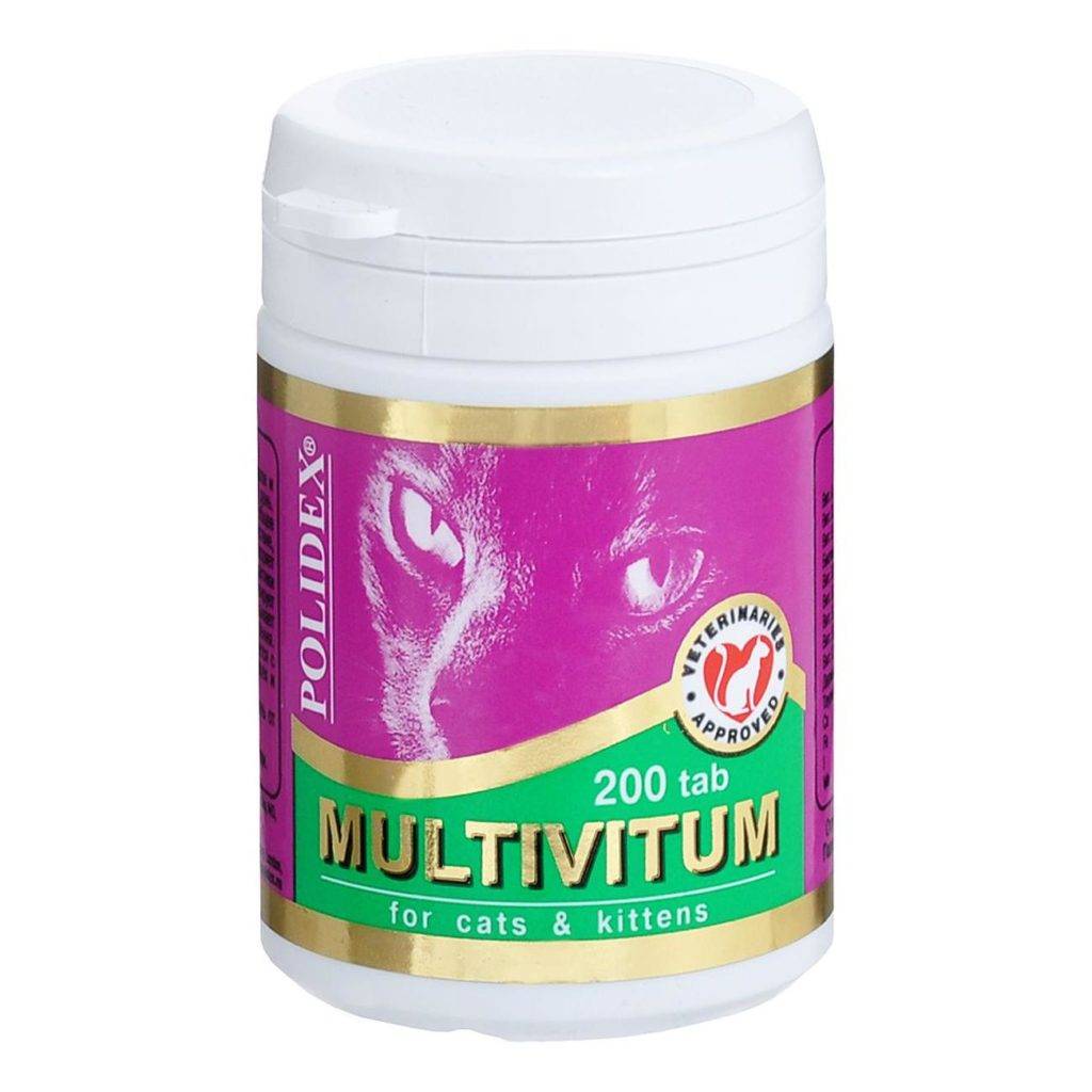 Такие комплексы могут содержать как много витаминов и полезных веществ (общеукрепляющие), так и быть направленными на устранение нехватки конкретного витамина (их, как правило, принимают курсом). Витаминные добавки также делятся по предназначению (для котят, взрослых, ослабленных и пожилых кошек), по форме выпуска (капли, лакомства, таблетки, мальт-пасты, инъекции, гели).
