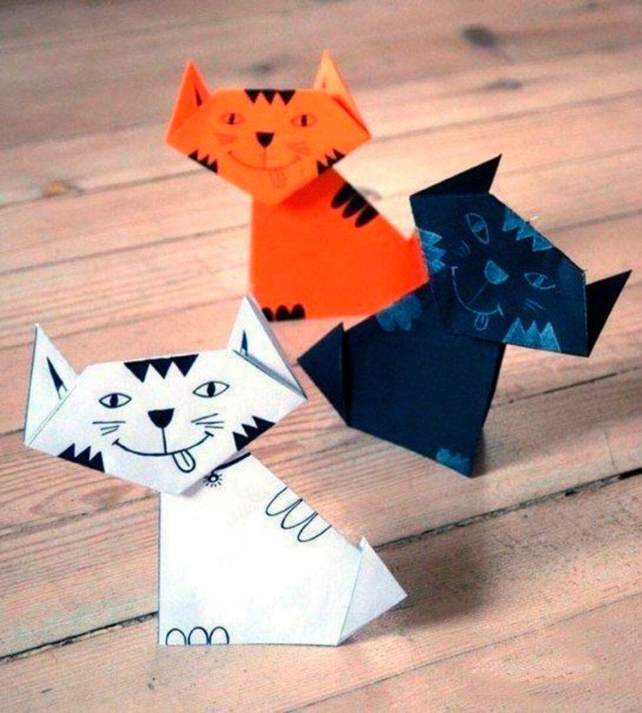 В технике простого оригами вы легко сможете сделать и объемную кошку. Очень нравятся детям котята, сложенные по схеме Джо Накашима.