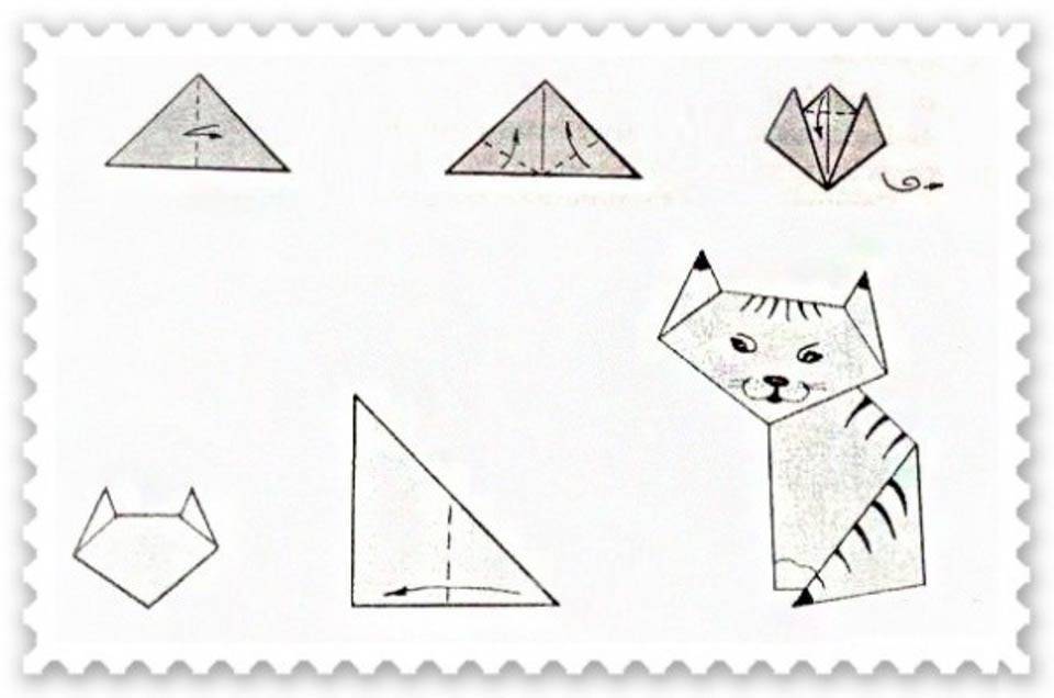 Кошку из бумаги сможет сложить даже 3-4-летний ребенок. Понадобится небольшой лист бумаги или салфетка. Если вы только осваиваете эту технику, воспользуйтесь трафаретом-шаблоном, на котором схематически показана последовательность работы. Пунктиром обозначают линии сгиба, а стрелками – направление.