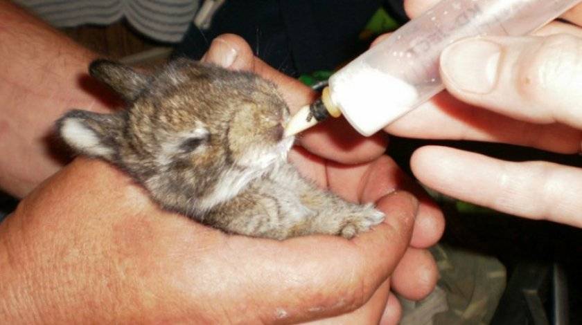 Когда еда будет готова, её наливают в чистую тарелочку, а из неё затем наполняют стерильную пипетку или шприц. Новорождённого ушастого держат в ладошке и аккуратно, по капле, выдавливают в рот из пипетки/шприца молоко. Нужно давать по 10 капель. Кормят крольчат 3–5 раз в день. За 1 раз малыш съедает около 1 мл молочной смеси. Перед едой нужно обязательно очистить животному кишечник, проведя массаж живота, а после еды — вытереть ваткой мордочку, влажной салфеткой протереть тельце.