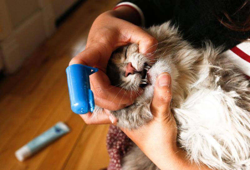 Многие хозяева игнорируют чистку зубов. Однако постоянный уход за полостью рта поможет сохранить животному крепость зубов. Необходимо приучать кошку к чистке зубов с ранних месяцев жизни, чтобы в будущем она адекватно воспринимала эту процедуру. Если кошка отказывается воспринимать традиционную чистку зубной щёткой или порошком, в зоомагазинах продаются специальные гели для дезинфекции полости рта. Можно сочетать их со специальными кормами и витаминами, включающими в себя грубые волокна. Чистить зубы рекомендуется раз в три-четыре недели.