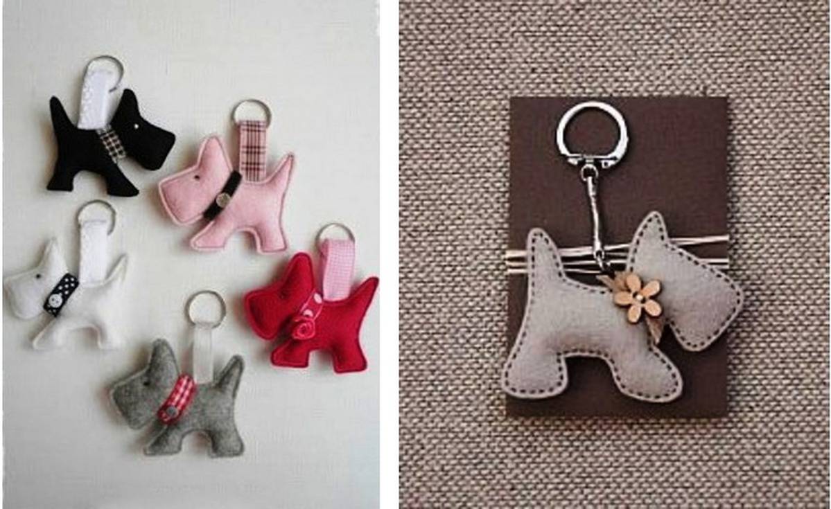 - Если вы хотите сделать из собачки елочную игрушку или брелок, не забудьте продеть в центральную часть головы петельку или пришить кольцо для ключей на ленточке.