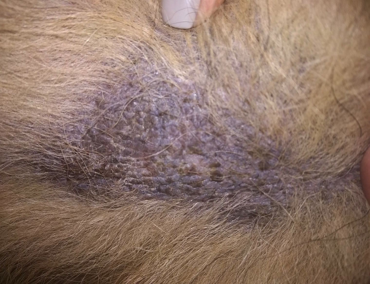 В начале болезни на коже появляется эритема (краснота), папулезная сыпь (мелкие прыщики без гнойного содержимого), шерсть в этих местах может приобретать ржавый оттенок. При этом собака, испытывая интенсивный зуд, старается почесать лапой, вылизать или потереть об предметы измененный участок тела, чем травмирует его. На больном месте появляются корочки, царапины, шерсть выпадает и на коже появляется неприятный сальный налет с характерным прогорклым запахом. При длительном течении малассезиозного дерматита без лечения кожа в пораженных местах лихенифицируется (утолщается, теряет эластичность и приобретает мозаичный рисунок) и гиперпигментируется (приобретает интенсивное серо-черное окрашивание).