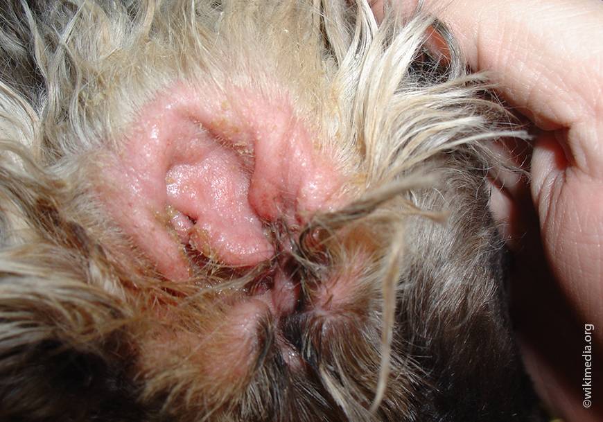 Поражение ушных каналов также вызывает зуд, из-за которого собака трясет головой, чешет уши. Кожа ушных раковин приобретает интенсивный красный цвет, может отекать. На складках раковины появляется большое количество коричневых мазевидных выделений. Кожа ушных раковин со временем также может лихенифицироваться и гиперпигментироваться.