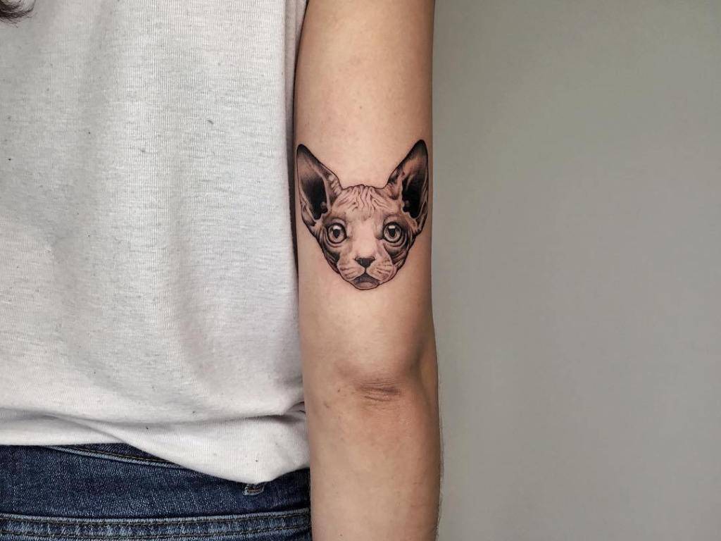Изображение домашних животных – популярное направление в нательной живописи. Набирает обороты по востребованности и тату с котом породы сфинкс