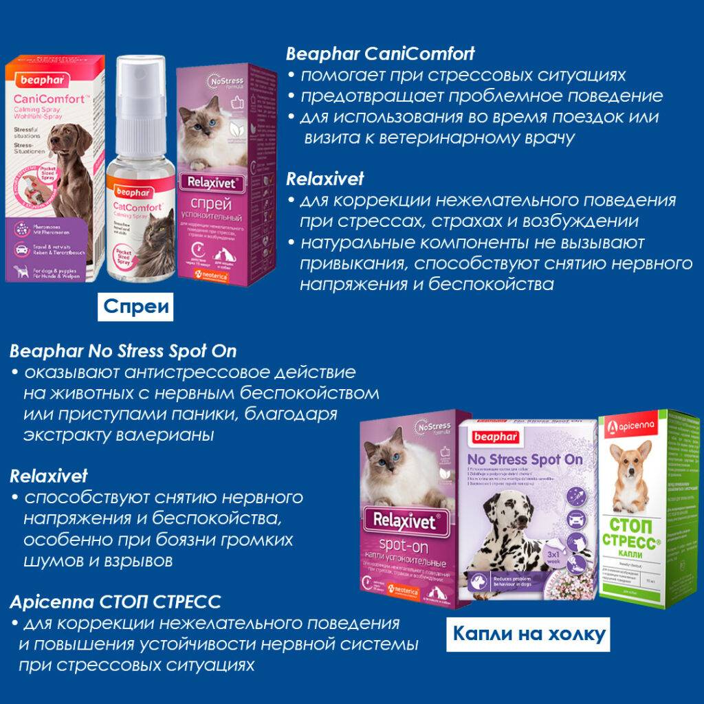- успокоительное средство для собак / котов в дорогу (успокаивают животное, притупляют чувство страха, купируют симптомы укачивания);