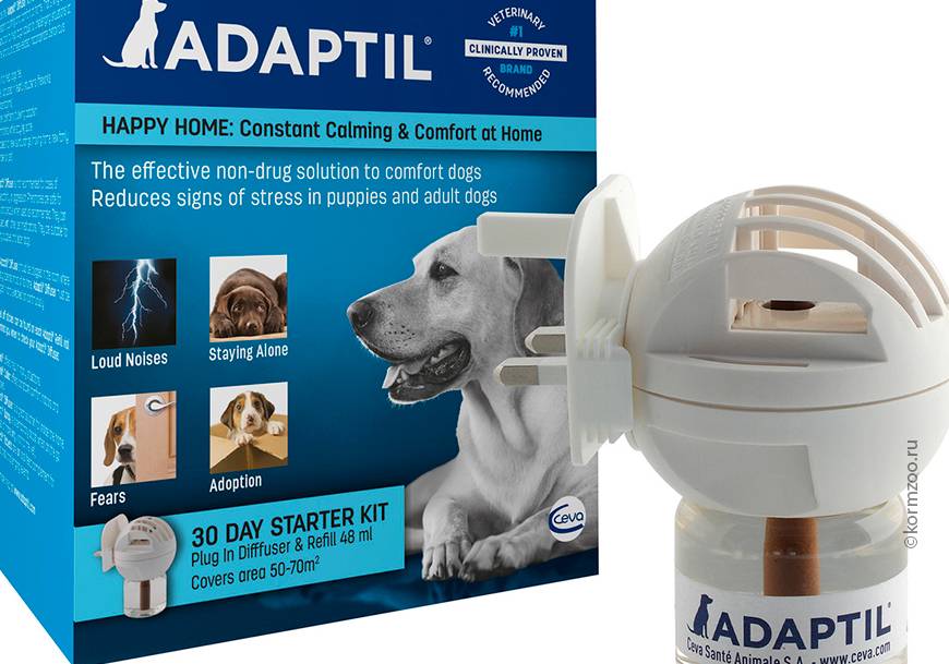 Под феромонами понимают летучие химические соединения, выделяемые организмом животных. Для производства успокоительных применяют синтетические вещества, схожие с теми, что продуцирует сука в период лактации. Это всегда мягкие средства, подходящие для длительного лечения, например, Адаптил и Help dog. Помимо этого, именно феромоны применяют в составе успокоительных ошейников для собак, УЗ-диффузоров.