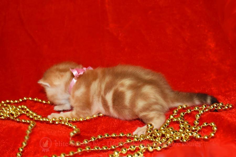 Под общим типом окраса – красный – подразумеваются британцы с рыжей, золотой или медной шерстью. Несмотря на великолепное качество шерсти, покровная гамма неравномерна: часто отдельные участки тела могут быть осветлены или тикированны. Обычно подушечки и кончик хвоста золотистых британцев несколько светлее, чем основной окрас, а на лбу встречается полосатый рисунок.