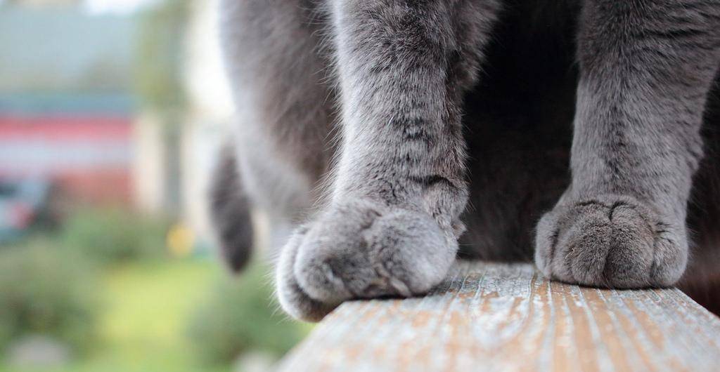 Ноги длинные, прямые. Лапы у русской голубой овальные, с мягкими упругими подушечками лилово-розового окраса. У «американцев» подушечки розовато-бежевого тона.