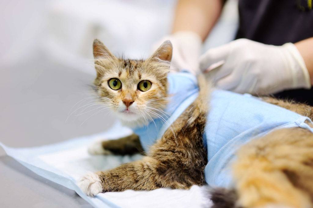 Первое время после операции кошке нужен покой. На животное надевают специальный бандаж, чтобы кошка не вылизывала послеоперационную рану.