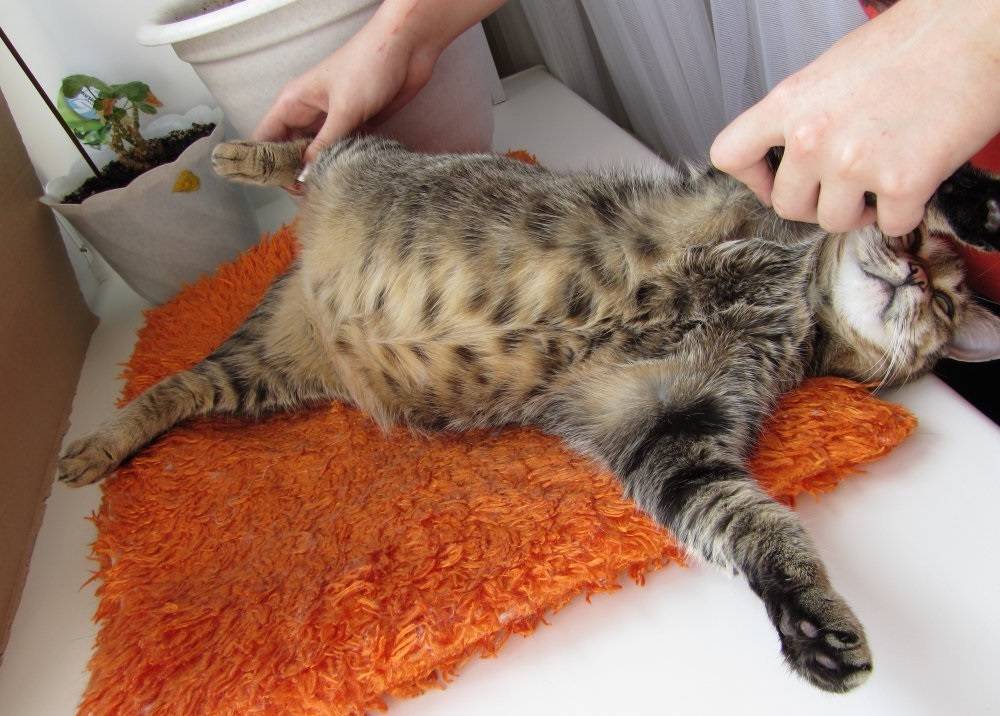 Брюшная стенка напряжена и резко болезненна. Повышается газообразование, живот надувается, становится твердым, содержимое в кишечнике громко урчит. Это можно выяснить простым прощупыванием живота кошки.